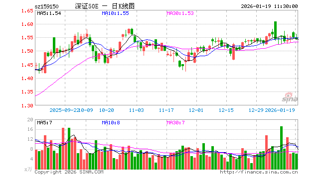1月19日,截止午间收盘,深证50ETF易方达(159150)跌0.45%,报1.541元,成交额939.25万元。深证50ETF易方达(159150)重仓股方面,宁德时代截止午盘跌1.42%,美的集团涨0.06%,中际旭创跌1.78%,东方财富跌1.59%,新易盛涨1.44%,立讯精密涨0.52%,比亚迪涨0.13%,阳光电源跌0.24%,五粮液跌0.54%,北方华创涨0.02%。